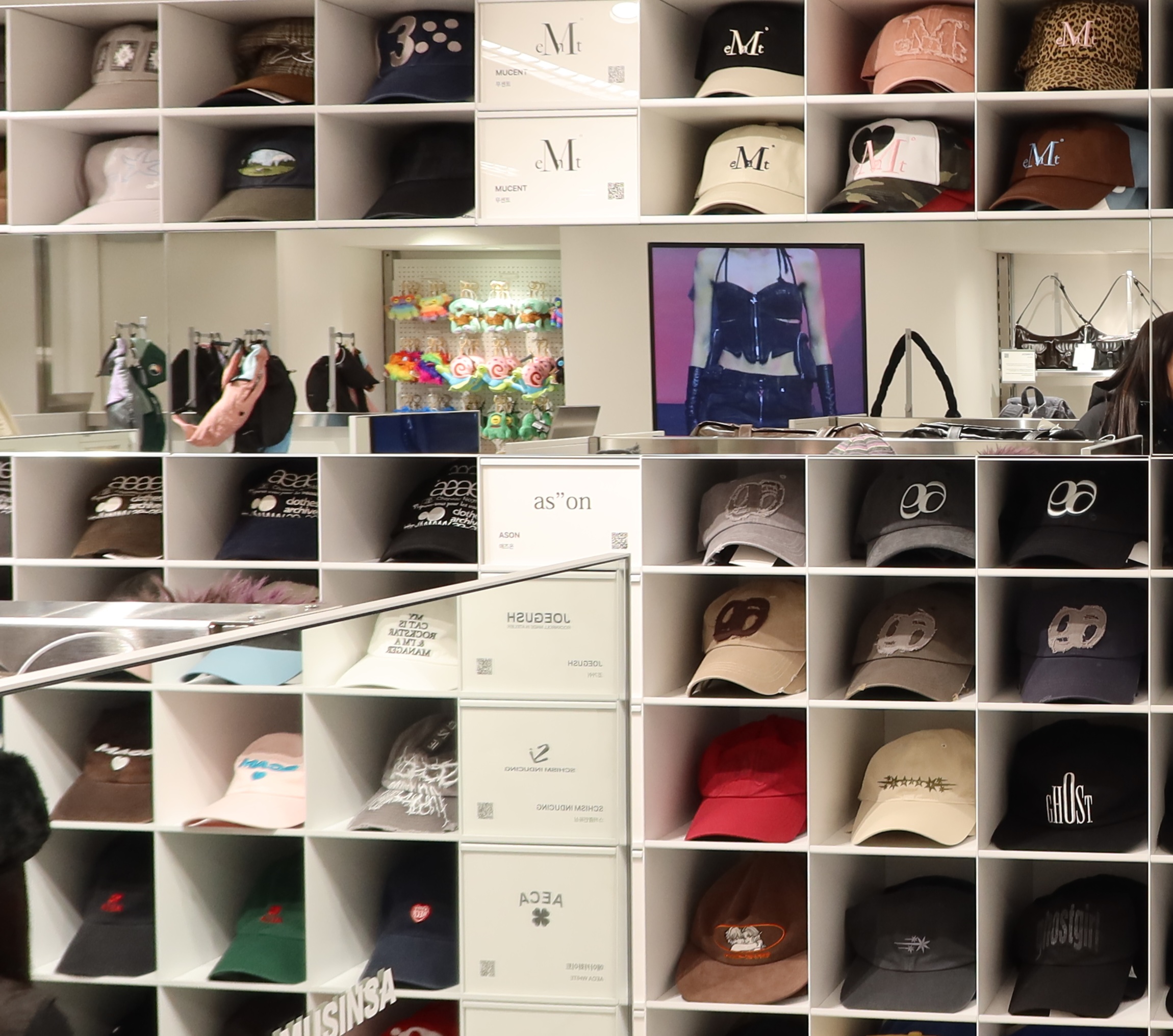 벽면을 모자와 소형 가방으로 가득 채운 구조로, 로고 중심 상품 배열이 특징입니다.